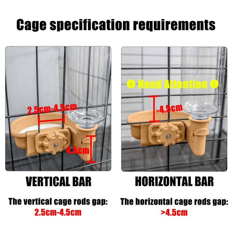 - Please check whether the cage/hutch/crate meets the installation requirements, please follow the pictures to verify your bar space: Vertical bar 2.5 - 4.5cm, Horizontal bar > 4.5cm.