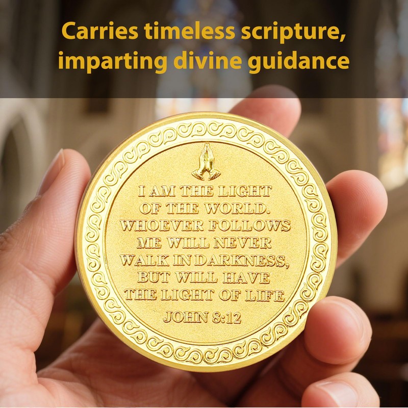 - A Guiding Light for Your Faith: This Christian challenge coin is engraved with the powerful words, "I am the light of the world," reminding you that Jesus is the guiding light in your life. The back of the coin features the full scripture from John 8:12, "Whoever follows me will never walk in darkness, but will have the light of life," offering assurance and hope. This meaningful token serves as a constant reminder of Jesus' promise, making it perfect for spiritual growth and inspiration, whether you carry it daily or display it as a symbol of faith