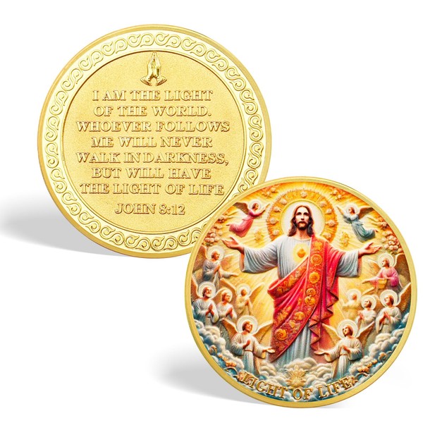 Tokenara Jesus Light of Life Christian Challenge Coin with John 8:12 Bible Verse, Divine Savior with Angels Religious Coin, Inspirational Christian Faith-Based Gift for Men Women