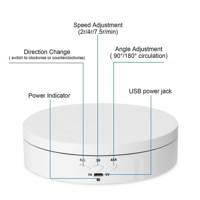 - 【360 Degree Electric Turntable】 The electric rotating stand allows for a 360° rotatable photo turntable that presents products from all directions. With three angles of 45°, 90°, and 180°, the turntable can be rotated clockwise or counterclockwise to showcase your products optimally.
