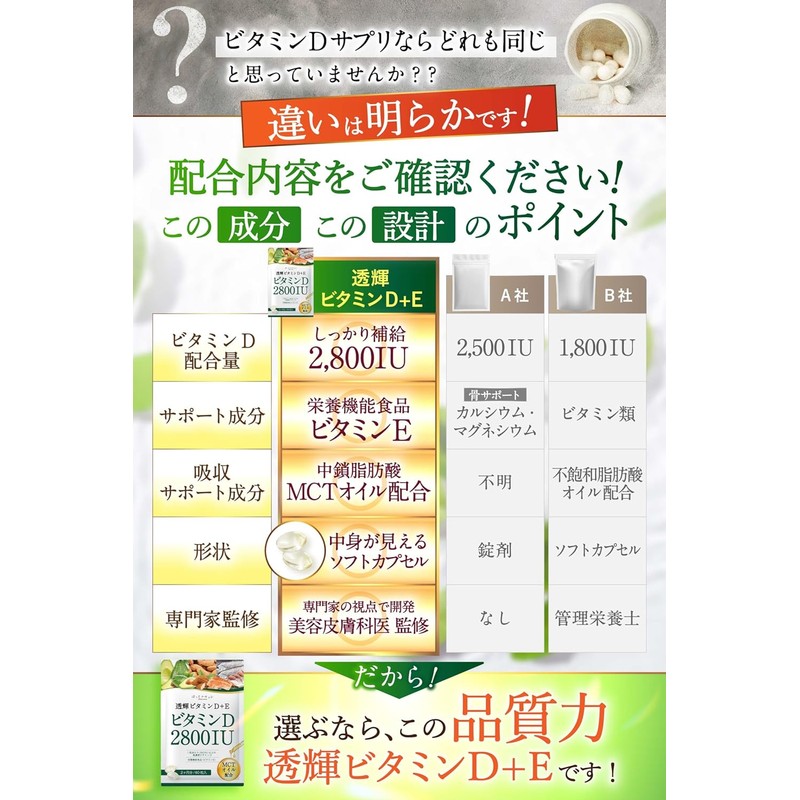 Developed under the supervision of a dermatologist, this supplement is designed to help you maintain radiance and well-being every day. Each softgel contains a high concentration of Vitamin D3 (2800 IU) and Vitamin E, balanced to deliver the nutrients you need while minimizing the risk of overconsumption. -