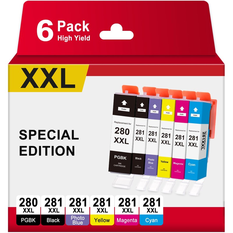- Package Contents: 1 Large Black 280XXL, 1 Small Black 281XXL, 1 Cyan 281XXL, 1 Magenta 281XXL, 1 Yellow 281XXL (NOT Include Photo Blue, Total 5 Pack)