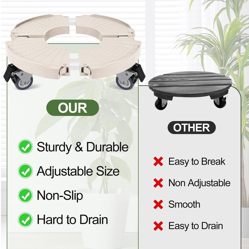 - 【Adjustable Size】Plant rollers with wheels can be adapted to different sizes of pots and are suitable for moving most plants. Adjustable range is from 15.7 inches to 22.7 inches. Adjustable plant caddy adds 4 inches of height to planters, preventing plants from damaging and scratching the ground