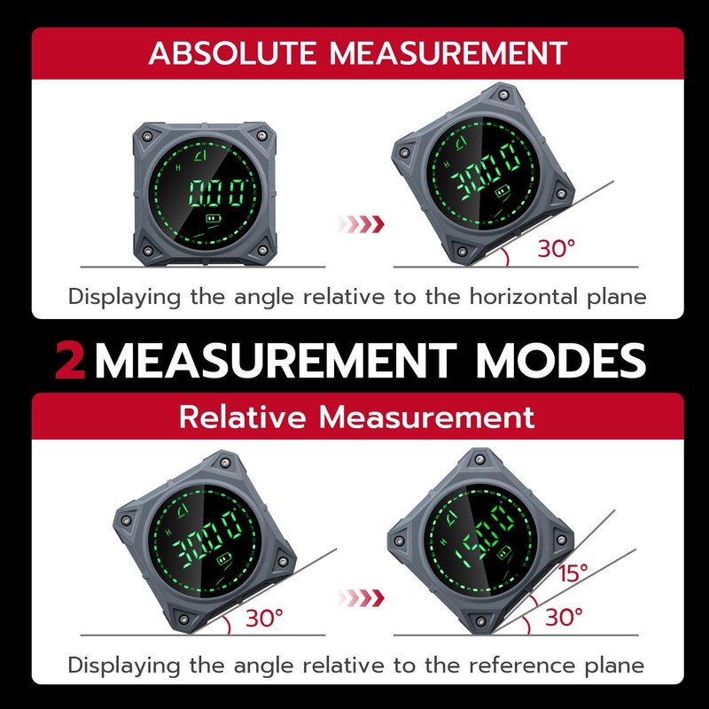 5. Beep Tone: This product has a built-in beep function, which emits a fast beep when detected the following standard angles: 0°, 30°, 45°, 60°, 90°. If there is a deviation within ± 1° from the standard angle (excluding negative angles), a slow beep will sound as a reminder.
