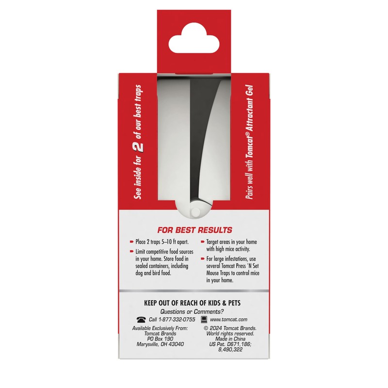 All it takes is one simple set. The Tomcat? Press 'N Set? Mouse Trap is guaranteed* to kill mice and allows for easy, no-touch disposal. These plastic, spring-loaded snap traps are easy to set and reduce the risk of pinched fingers. To use, place a pencil eraser-sized dollop of food such as peanut butter into the bait well. After baiting, pull the set bar back the entire way until you hear a "click" to tell you it is locked. Mice have a natural tendency to run along walls as they move from hiding to feeding, so we recommend placing traps with the bait well facing the walls of rooms or cupboards where activity is suspected, such as kitchens, utility rooms, or garages (droppings and oily marks along baseboards are a telltale sign of activity). Once the mouse has been killed, pick up the trap using the grab tab and dispose of the trap and the mouse in the trash. Your fingers will never touch the dead mouse! This package of Tomcat? Press 'N Set? Mouse Trap contains 2 disposable mouse traps. *Tomcat Brands Guarantee: If for any reason you, the consumer, are not satisfied with this product, mail us your original proof of purchase to obtain a full refund of your purchase price.