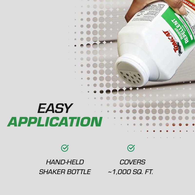 It is time to put a stop to unwanted visitors taking over your home. Tomcat? Repellents Rodent Repellent Granules prevents mouse and rat entry, nesting, and foraging outdoors. It is formulated with an essential oil blend that delivers a smell and taste rodents can't stand. Humans, on the other hand, go unbothered, as the formula is no-stink to us. In addition, the product is safe for use around kids and pets (when used as directed). Tomcat? Repellents Rodent Repellent is rain-resistant and long-lasting with an application that should be repeated every 30 days. No matter where you apply, Tomcat will be ready to protect. Apply this product liberally to the soil or turf around your home, garage, or outdoor structure. To use, hold bottle with shaker top pointed forward and down. Shake bottle side to side to dispense. This 2 lb. container of rodent repellent granules covers up to 1,000 sq. ft.
