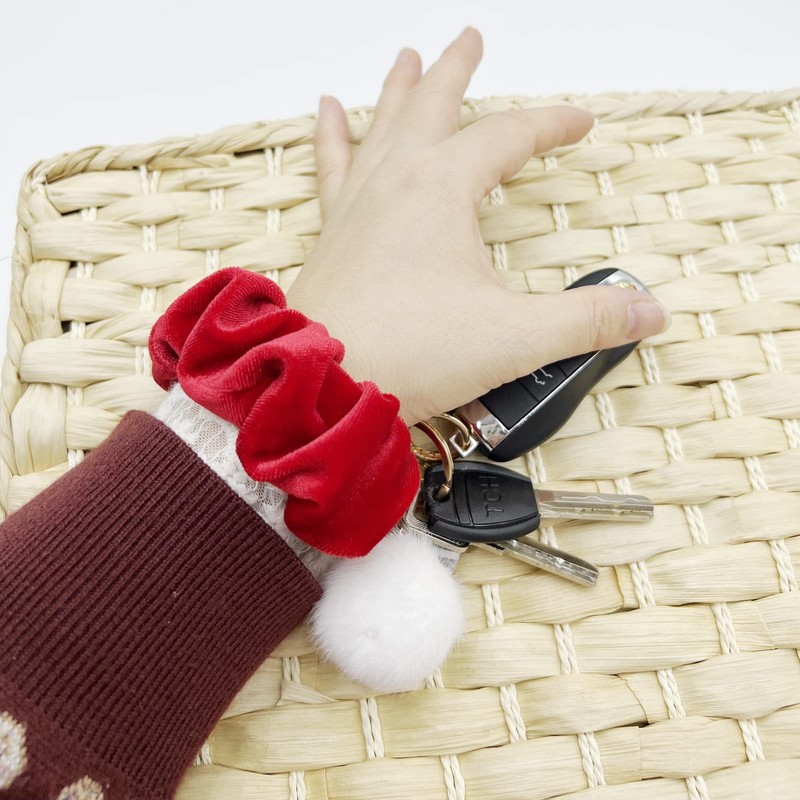 - 【Package including】: 1 piece red velvet scrunchie wristlet keychain with grey tassels flower white fur pom and gold stainless steel key ring .