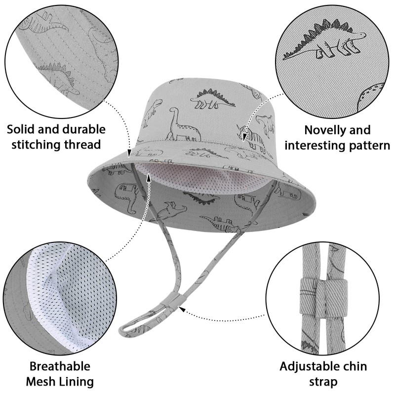 - [100% Cotton Material]: The baby sun hat is made of 100% cotton material, breathable, skin-friendly, lightweight, and printed with cartoon dinosaur prints, washable and durable. The breathable mesh lining greatly keeps baby's head cool, dry and ventilated.