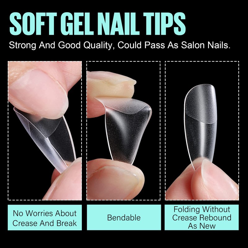 - 【TRACELESSS & BREAK RESISTANT】TOMICCA soft gel full cover nail tips are made of PMMA high-grade resin material, which is soft and naturally elastic, without cracks and white marks when bent. Have no toxins, no smell, no harm to your nails and health. Easy to Apply, Pre-shaped, Long Lasting, Soak-off Nail Extension Set.