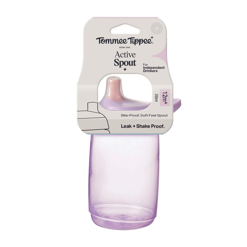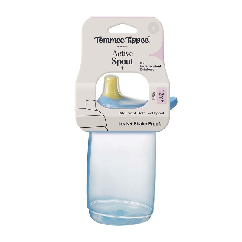 Tommee Tippee Active Spout Cup, 390ml, Non-Spill Bite-Proof Water Bottle for Toddlers 12 Months+, with Easy-Grab Handle and Two-Piece Valve to Help Stop Spills, Assorted Colours, 1 Pack