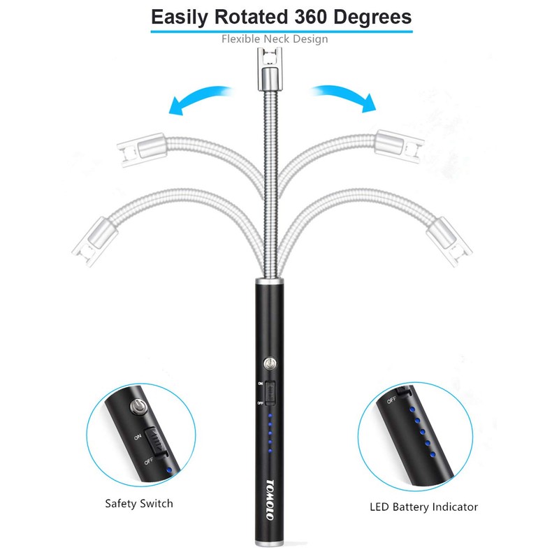 TOMOLO Electric Rechargeable Candle Lighter Grill Lighter Arc Lighter with Flexible Neck, LED Battery Display Safety Switch for Candle Camping Cooking BBQs Fireworks (Black&Silver)