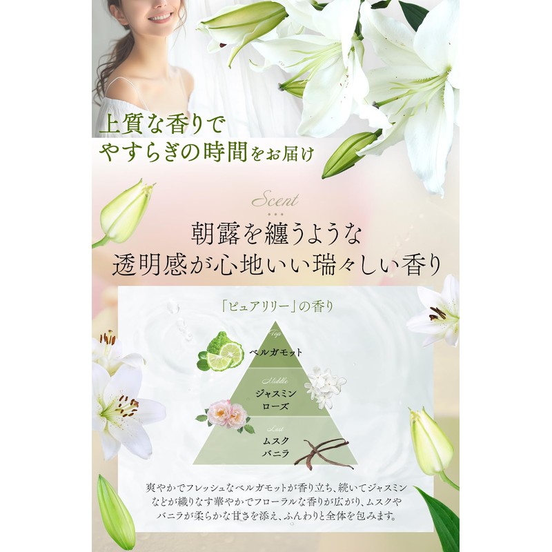 - (A pleasant and refreshing scent that is as transparent as it encases morning dew) It transfers from refreshing dignified research to a gorgeous and luscious floral scent. It blends with the quiet depth of musk to create a neat yet memorable scent