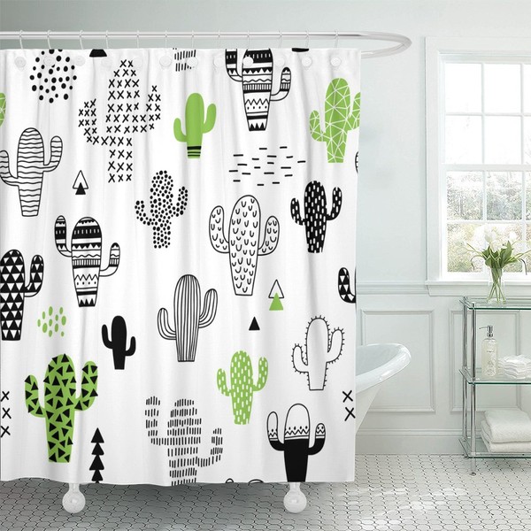 TOMPOP Shower Curtain Black Desert Cute Hand Drawn with Cactus Hipster Geometric Waterproof Polyester Fabric 72 x 72 inches Set with Hooks
