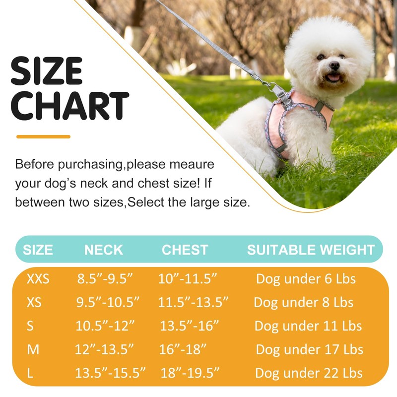 - Measure Before Ordering; This harness is designed for small dogs only. Size "Large" is NOT mean it is suitable for large dogs! It's just the maximum size of this harness! Besides, different brands have different size data, so with each purchase, please check the size chart information carefully. If in between sizes, please order NEXT SIZE, which has room for growth.