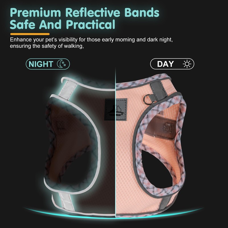 - Reflective & Adjustable Puppy Dog Harness; Super 360°highly reflective strips is designed to reflect ambient light under extreme low light conditions, it can provide maximum visibility when dogs walking at night. Our No-Choke dog harness can distribute the pulling pressure evenly to the dog’s body and protect dog's trachea and throat from pulling and choking.