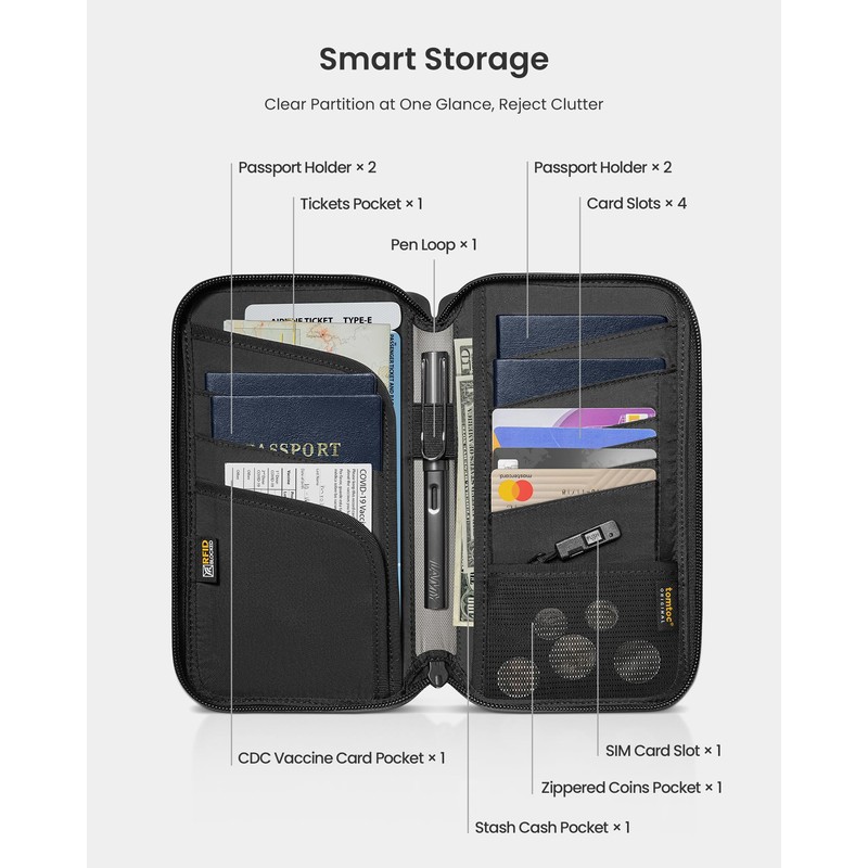 - Flexible Inside Organization: Measures: 9.45" x 5.12" x 1.18", Holds up to 6 passports (4 designed passport slots + 2 roomy cash/document slots), 4 credit cards & travel documents. It also includes an internal travel pen holder, a Vaccine Card Holder with a hidden AirTag slot, a coin pocket with a Sim Card Holder, and an Eject Pin. Ideal for you to keep all your travel values organized on the fly.