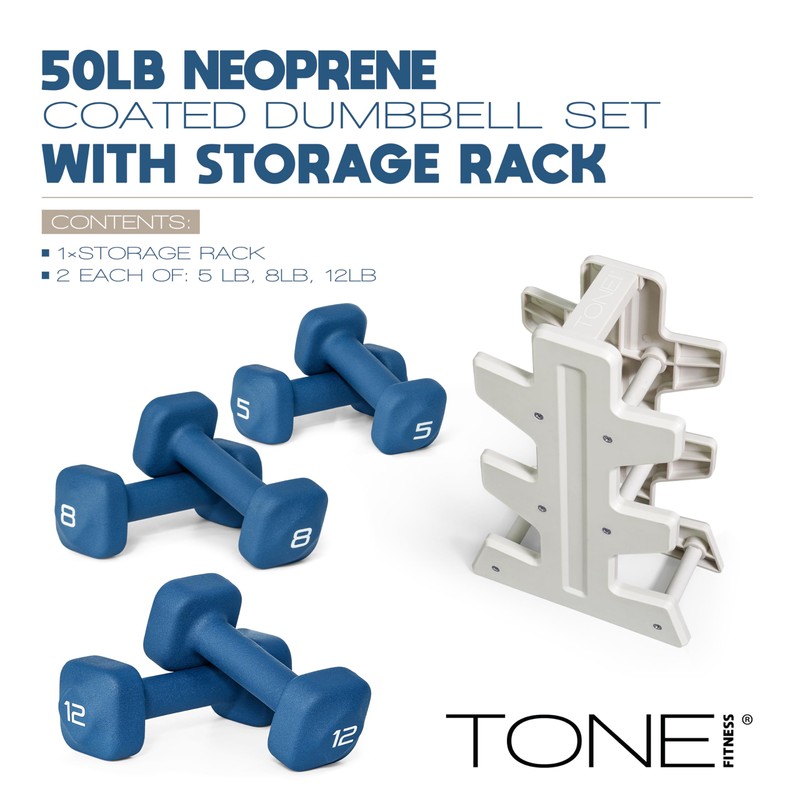 Tone Fitness 50 LB Neoprene Dumbbell Set with Storage Rack – Non-Slip, Anti-Roll Hand Weights for Home Gym Workouts - Blue