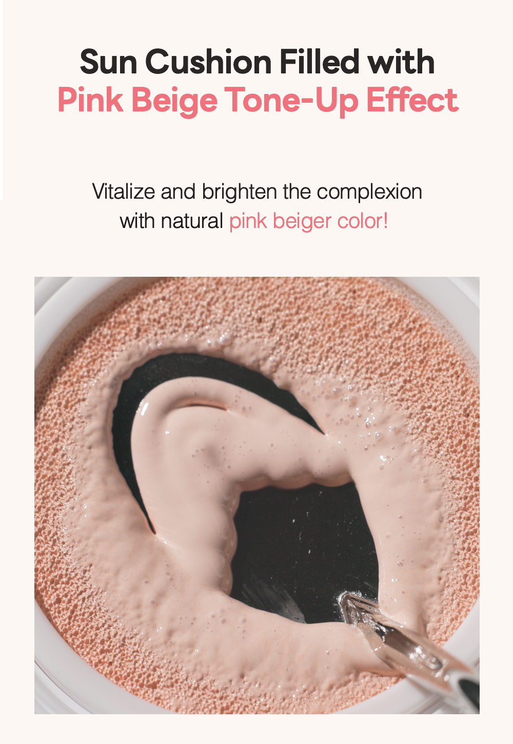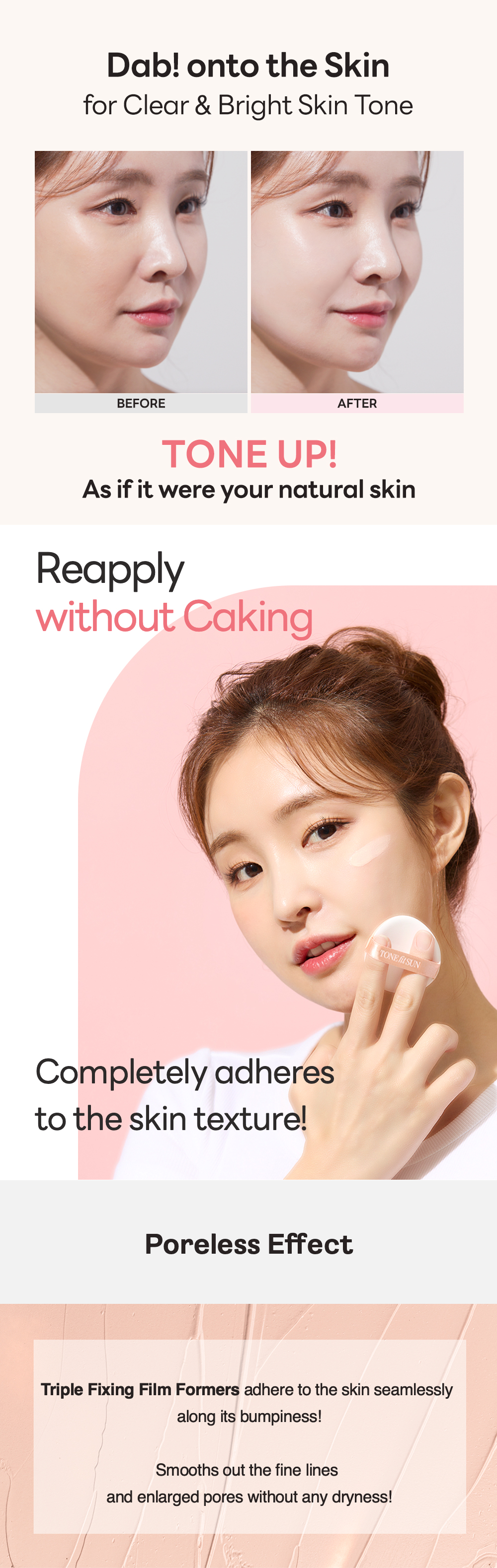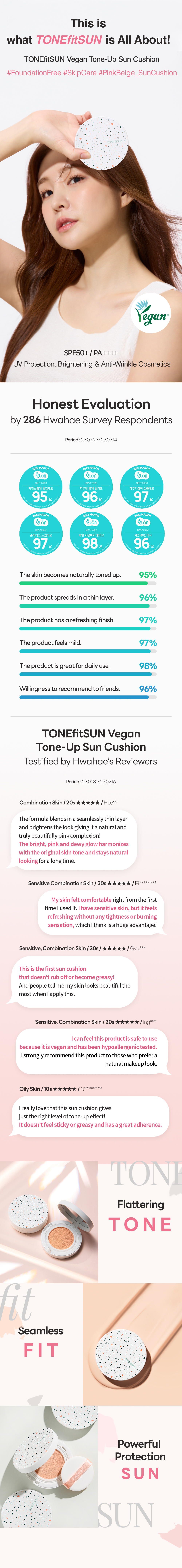 TONE FIT SUN Vegan Tone-up Sun Cushion is a three-in-one functional product that allows for meticulous sun protection indoors and outdoors, and can be used in a foundation-free, skin skip care routine for sun protection, brightening, and wrinkle improvement. Sun protection index is SPF50+ /PA++++. TONE FIT SUN Vegan Tone-up Sun Cushion is a product for sun care that can't be forgotten even in winter, recommended as Ryeong-ryeong's Sun Cushion. This product is featured as foundation-free, skip care, and pink beige foundation cushion. A pink beige TONE FIT SUN product that is simply FIT on a single tap to give a revitalizing TONE. Your feelings are your freedom. Express your FIT with TONE FIT SUN, whenever and wherever you want. With a sun protection index of SPF50+ /PA++++, it confidently keeps you safe from the sun. Gives a pink beige vitalizing tone-up function. Helps to create a flawless skin. No.21~23 are all suitable for use. A Natural Fit product that is foundation-free. Maintains a moist texture without crumbling even after reapplication. Expresses a smooth fit without any tightness or crumbling. Low-irritative, non-chemical ingredient that is safe to use and protects from UV rays. Has a skin brightening function. Wrinkle-improving functional product that cares for weakened skin. On the initial skin irritation testing, it received a “low irritation” level, so it is safe for use. We all have different skin concerns and choose different skincare products based on our skin concerns, and TONE FIT SUN provides the necessary skincare solution that fits you by considering all those various skincare concerns. This is a TFS TONE FIT SUN product that you must keep on your makeup stand and in your bag. From the TONE FIT SUN Product Line, this TONE FIT SUN Vegan Tone Up Sun Cream is 100% Zinc product, fits strongly on the skin, non-chemical, tone-up functional sun cream, and smoothly fits to the skin.