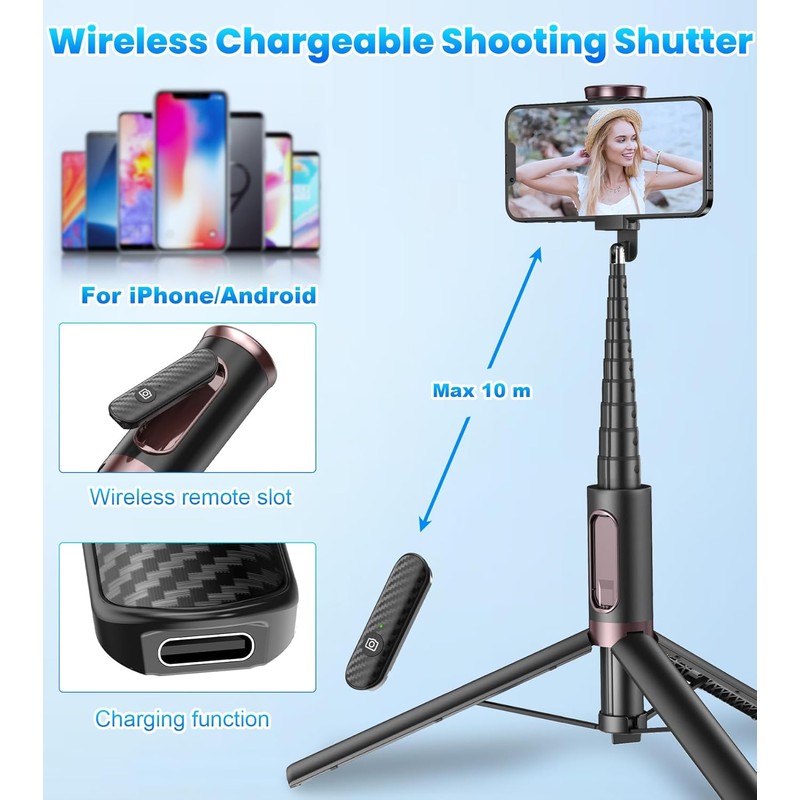 - Obturador remoto cargable: el trípode para teléfono tiene un control remoto inalámbrico recargable incorporado, admite disparos dentro de 32.8 ft, es compatible con iPhone/Android, se da cuenta rápidamente del emparejamiento, y la operación es muy simple. Cuando el control remoto no está en uso, se puede poner en la ranura especial del control remoto en el mango del selfie stick para iPhone para evitar que se pierda. El rango de montaje del soporte del teléfono del trípode es de aproximadamente 2.28 -3.46 pulgadas de tamaño, que es adecuado para teléfonos de 4-7 pulgadas