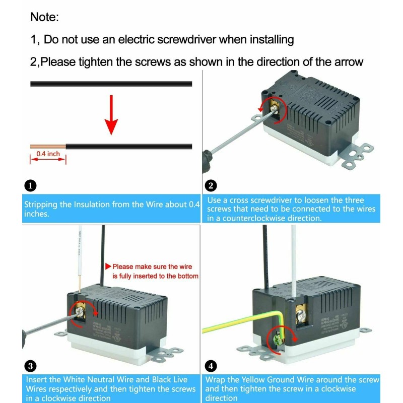 Back and side wired for easy installation.Caution: Do not unscrew the terminal screws too far or with excessive force. Do not use power tools to loosen the terminal screws.
