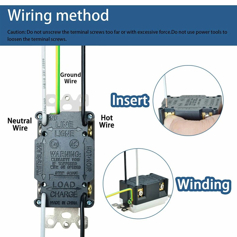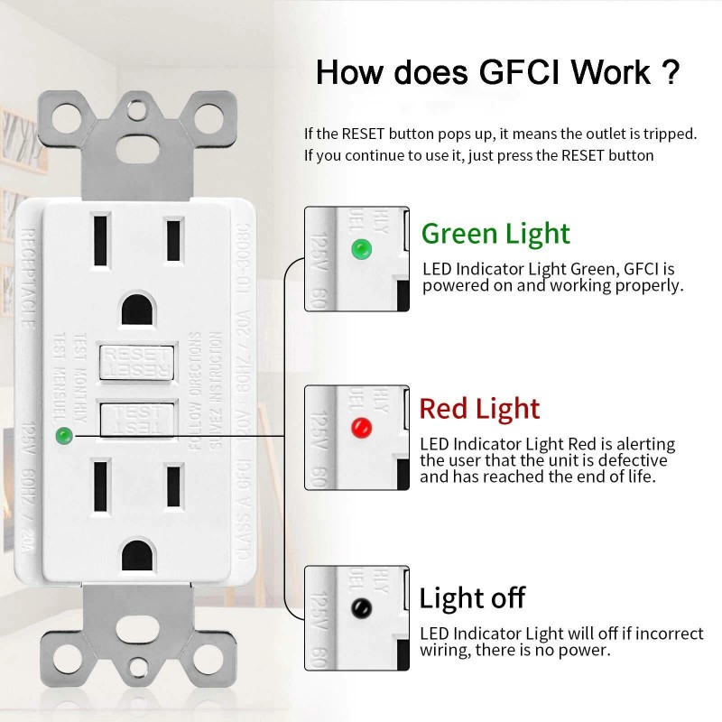 Warning Tips: The GFCI socket needs to be tested whether it can work normally before using. The Green Light indicates that the wiring is correct.1.plug the night light into the outlet, and the light should be on. 2.Press the "Test" button, the” Reset“ button will pop up and the night light will turn off. If you press the test button and the reset button pops up but the night light still on, it indicates that the leakage protection is faulty. Please replace the socket.