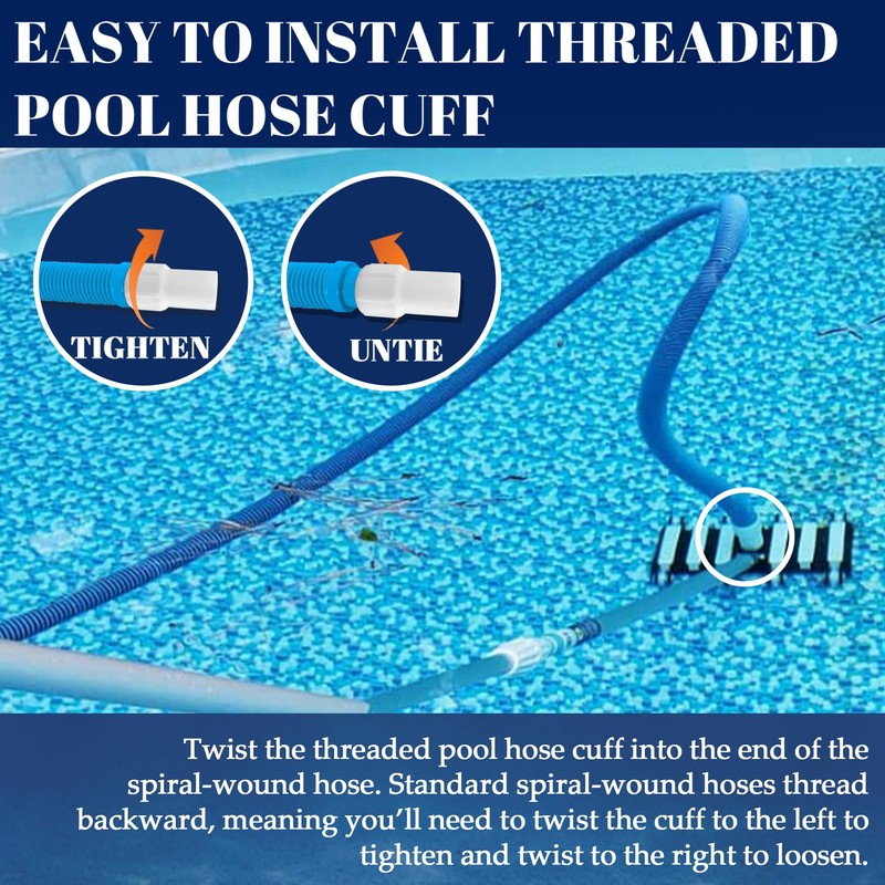• EASY TO INSTALL THREADED POOL HOSE CUFF - Twist the threaded pool hose cuff into the end of the spiral-wound hose. Standard spiral-wound hoses thread backward, meaning you’ll need to twist the cuff to the left to tighten and twist to the right to loosen.