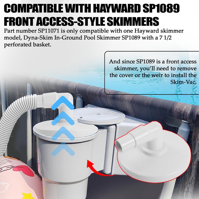 - COMPATIBLE Hayward SP1089 FRONT ACCESS-STYLE SKIMMERS - Part number SP11071 is only compatible with one hayward skimmer model, Dyna-Skim In-Ground Pool Skimmer SP1089 with 7 1/2 perforated basket. And since SP1089 is a front access skimmer, you'll need to remove the cover or the wire to install the Skim-Vac.