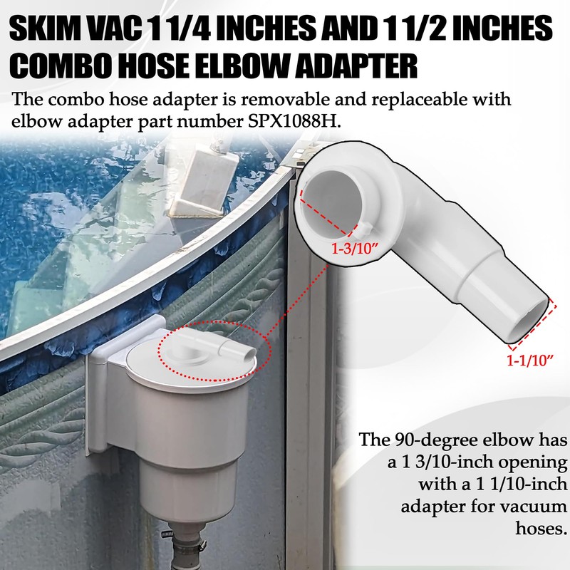 - SKIM VAC 11/4 INCHES AND 11/2 INCHESCOMBO HOSE ELBOW ADAPTER - The combo hose adapter is removable and replaceable with elbow adapter part number SPX1088H. The 90-degree elbow has a 1 3/10-inch opening with a 1 1/10-inch adapter for vacuum hoses.