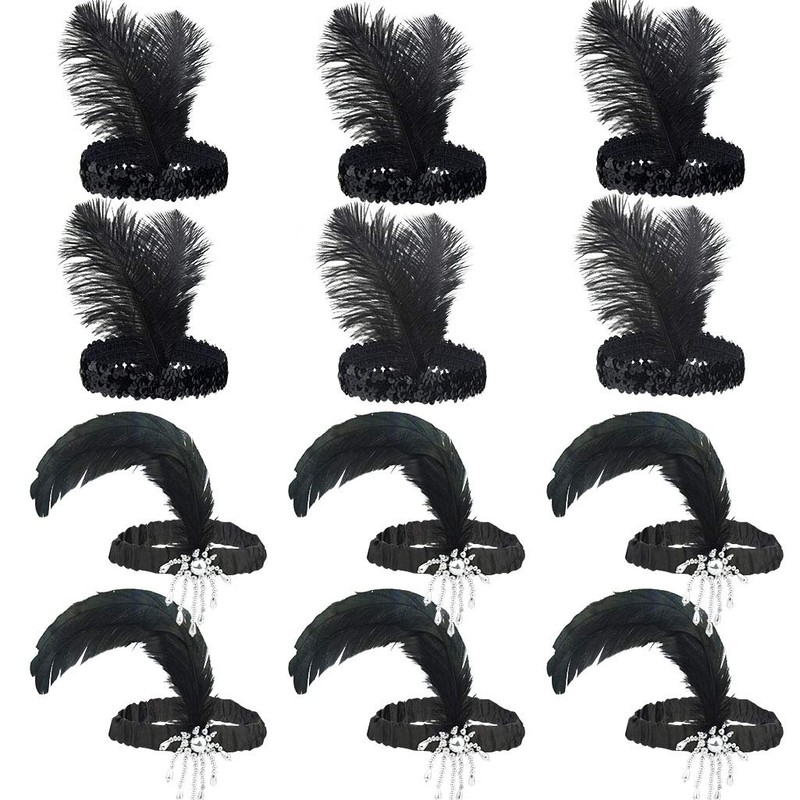 - What Will U Get:Package comes with 12pcs 2 style flapper elastic headband. They are 6pcs all-black flapper sequins feathers headband; 6pcs black flapper headband which has crystal beads and 3 feathers.