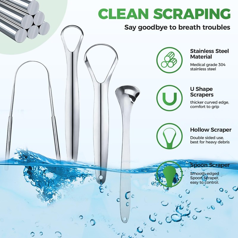 - Complete Metal Tongue Scraper Set -Includes 2 hollow scrapers in different sizes for debris removal, a spoon scraper for smooth scraping, and a U-shaped scraper for thorough cleaning Suitable for adults and kids, this versatile set ensures effective tongue cleaning for all users.