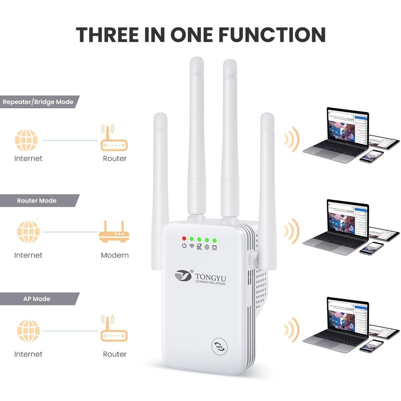 Efficient WiFi Transmission Speed WiFi range extender boosters transmission network to WiFi dead zone. Provide faster and more stable Internet signal transmission. Ideal for HD video streaming and gaming. Excellent performance with External Antennas Has a 2.4GHz band signal up to 300Mbps. Compared with other wifi repeaters, tongyu repteater has longer transmission distance, stronger penetration power, wider coverage and faster transmission rate. It's excellent performance makes it not only suitable for web browsing, emailing and downloading, but also suitable for HD video streaming, HD online gaming and other activities that require high data transfer. Stable WiFi Signal The double-sided heat dissipation design greatly improves the heat dissipation effect of the machine when it is working, and effectively ensures the long-term stability and life of the machine. Signal clear and clear signal indicator It is convenient to detect the strength of the wifi signal, the green light means the signal is strong, and the red light means the signal is weak. One Ethernet Port - support wired connection The Ethernet port allows this extender to act as a wireless adapter to connect devices that don't have their own wireless capabilities, such as Blu-ray players, Echo/Alexa devices, and Internet TVs, for more efficient transmission. 3 in 1 Fuctions: Extender Mode - Extends the WiFi coverage of an existing wireless network. Wireless Router - Create an instant private wireless AC networ Wireless Access Point Mode - Converts a wired network to a wireless network Easy to Install: Quickly Setting Methods The WPS button is automatically connected with one key, and it is set within few seconds. ② Just a few simple steps to set up to connect to existing wifi in minutes.