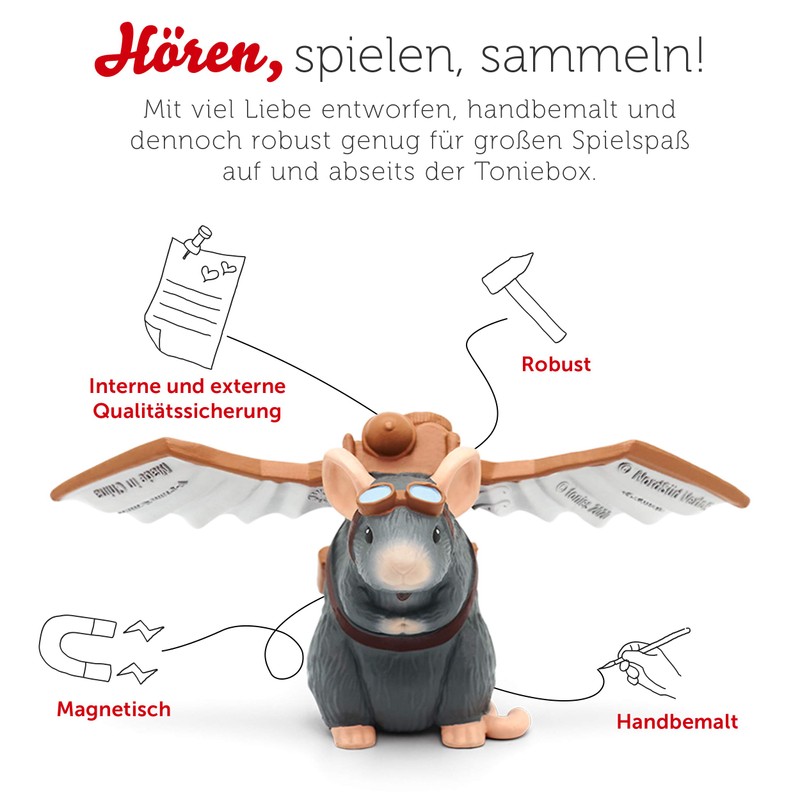 - Box contents & details - Tonie figure Charlie the mouse, including Tonie audio play: Lindbergh - The adventurous story of a flying mouse, for children ages 5 and up, playing time approximately 43 minutes.
