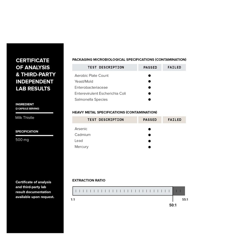 - The Highly Active Form of Milk Thistle - Toniiq Milk Thistle capsules contain 500mg of the highest quality milk thistle in each pill– ethically sourced, grown and cultivated using an extraction process to ensure a 50:1 extract ratio (or the equivalent of 25,000mg of raw milk thistle powder).