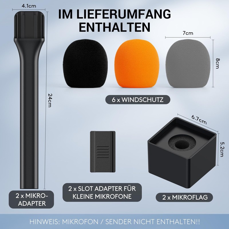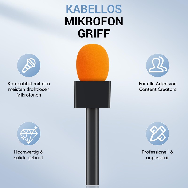 COMPATIBLE WITH ANY WIRELESS LAVALIER MICROPHONE: Our microphone grip is equipped with a slot that is perfect for all sizes of wireless lavalier microphones, such as DJI Mic, DJI Mic 2, Rode Wireless GO Series, Hollyland Lark Series, Baybesta wireless microphone and much more. THREE PREMIUM RESPIRATOR SHIELDS (Black/Orange/Grey): Made from high quality materials, these wind protection foams ensure a secure and snug fit on the handle and effectively reduce wind and ambient noise for improved recording quality. They are odourless, non-toxic and have a smooth and elastic surface. Plus, their logo-free design ensures the undivided attention of the audience during your interviews. Removable and customizable micro flag: easy to take off and securely attach so that everything stays in place. You can personalise them with custom logo stickers, such as your transmitter's emblem to give your recordings a professional look. Wide range of applications: with this handheld adapter, you can easily convert your mini microphone into a hand microphone, which makes it more convenient to use and increases the professionalism of your videos. For various purposes such as interviews, reportages, live streaming, YouTube, TikTok, podcast recordings and more. Portable & Sturdy: The microphone grip is made of high quality ABS plastic, which ensures sturdiness and durability. Weighing only 145 g, the Lavalier microphone sits comfortably in the hand, you can easily carry this mini microphone to any interview word.