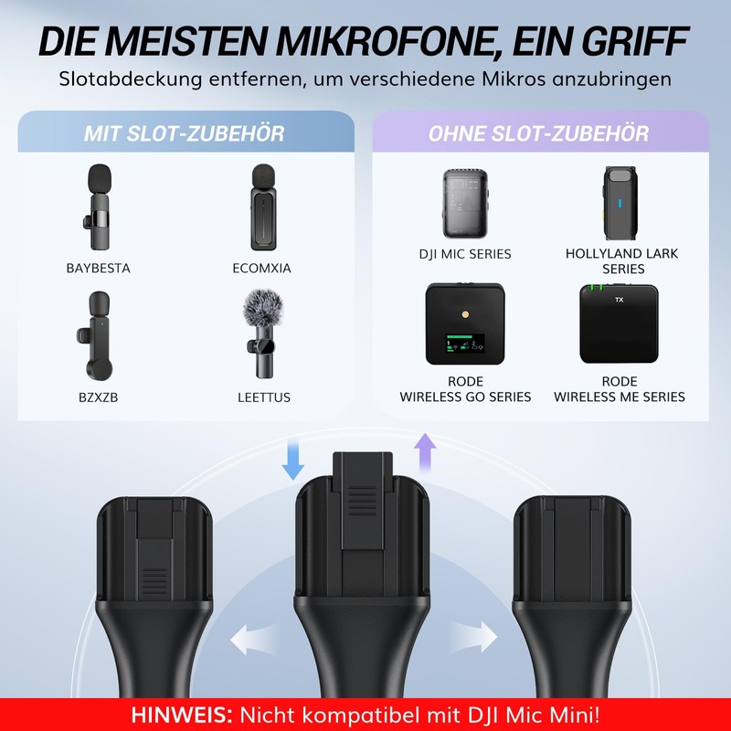 • Wide range of applications: with this handheld adapter, you can easily convert your mini microphone into a hand microphone, which makes it more convenient to use and increases the professionalism of your videos. For various purposes such as interviews, reportages, live streaming, YouTube, TikTok, podcast recordings and more.