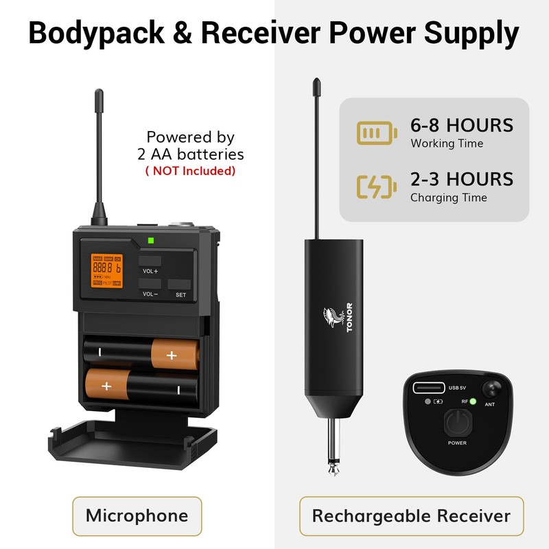 - Power Supply: Our receiver is designed to be rechargeable and portable. It takes approximately 2-3 hours to fully charge and offers a usage time of 6-8 hours. And the bodypack operates on 2 AA batteries (not included).
