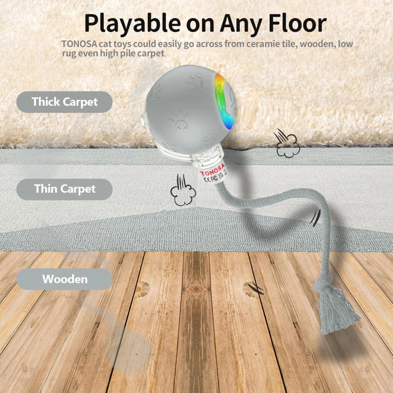 • **Versatile Play on Any Floor**: Equipped with a powerful motor, our electric cat toy rolls effortlessly on various surfaces, including thick carpets, thin rugs, and hard floors. This makes it an excellent choice among interactive cat toys for indoor cats, providing endless fun no matter where they play.