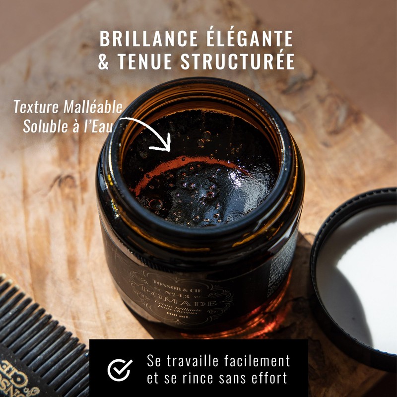 - Strong posture with gloss finish – this styling pomade ensures long-lasting hold and maintains the suppleness of the hair. It precisely structures the hairstyles and helps you maintain a clean, controlled and elegant style all day long.