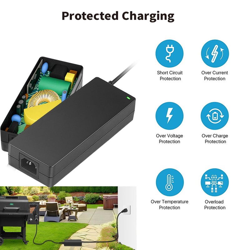High Output: Provides 12V 10A (120W) output, compatible with most GMG grill models. Built-In Protection: Features OVP (Over Voltage Protection), OCP (Over Current Protection), SCP (Short Circuit Protection), and overtemperature protection to ensure safe operation. Durable Design: High-quality materials including heat-resistant, fire-proof construction, rubberized texture, and extra-long 98.4 inch AC/DC cord.