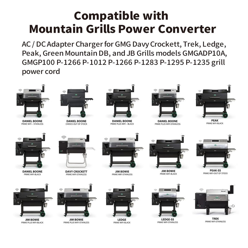 • [Compatibility] Compatible with: Green Mountain Grills Davy Crockett 12V Power Converter Adapter P-1001 GMG Green Prime, Prime Plus, and Mountain Series grills. Part Numbers: P-1235, GMGP100, P-1266 GMG Green Davy Crockett, TREK, Daniel Boone Prime , Prime Plus & Jim Bowie Prime , Prime Plus, LEDGE Prime, and PEAK Prime models.