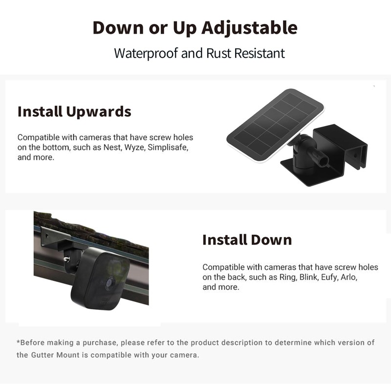 - [Compatible Security Cameras with 1/4"-20 Screw Hole] The Up Version is compatible with Google Nest Cam (outdoor or indoor, battery), Wyze Cam (v4, v3, Outdoor v2, Outdoor v1), and Simplisafe Outdoor Camera. The Down Version is compatible with: SolarBlink Outdoor 4, Blink cameras (Outdoor 3rd Gen, XT2, XT, Mini 2), Eu-fyCam (3, 3C, 2C Pro, 2C, 2 Pro, 2), Eu-fy SoloCam (S220, C210), Wyze Cam (Pan v3, Battery Cam Pro), Arlo cameras (Ultra 2, Pro 5S 2K, Pro 4, Essential 2K, Essential Spotlight, Go 2), Reolink Argus cameras (4 Pro, 4, 3E, 3 Ultra, 3 Pro, 3), and TP-Link Tapo cameras (C425, C420, C410, C402, TC85, TC82).