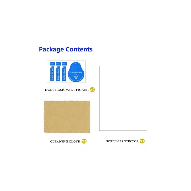 - Package included: 3-Pack screen protectors, Dust Removal Sticker, Microfiber cloth