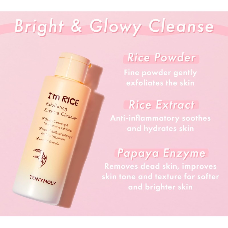 - I’m Rice Enzyme Powder Cleanser: A water-activated exfoliating powder that gently polishes away dead skin, removes impurities, and improves skin texture for a visibly brighter and smoother complexion.