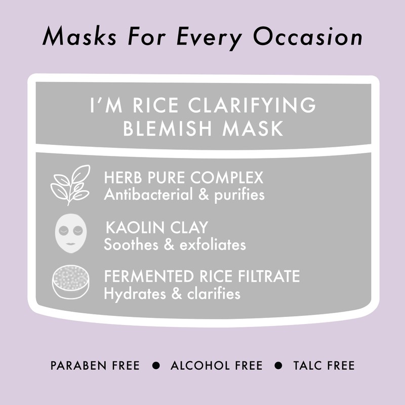 - Deeply Hydrating & Clarifying Blemish Mask: Infused with oil-controlling and antibacterial ingredients, this detoxifying mask soothes irritation, reduces breakouts, and helps control excess sebum for clearer skin.