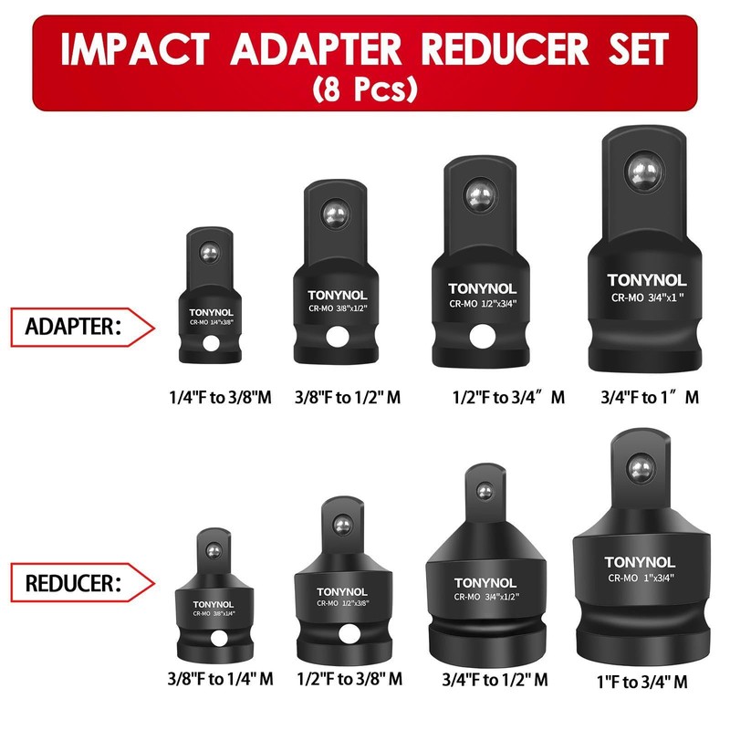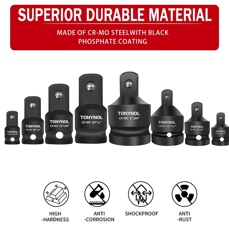 - 【PREMIUM CR-MO STEEL】:Crafted from heat-treated forged chrome molybdenum steel, the TONYNOL impact adapter set offers exceptional hardness and durability, ensuring reliable performance across different tasks.