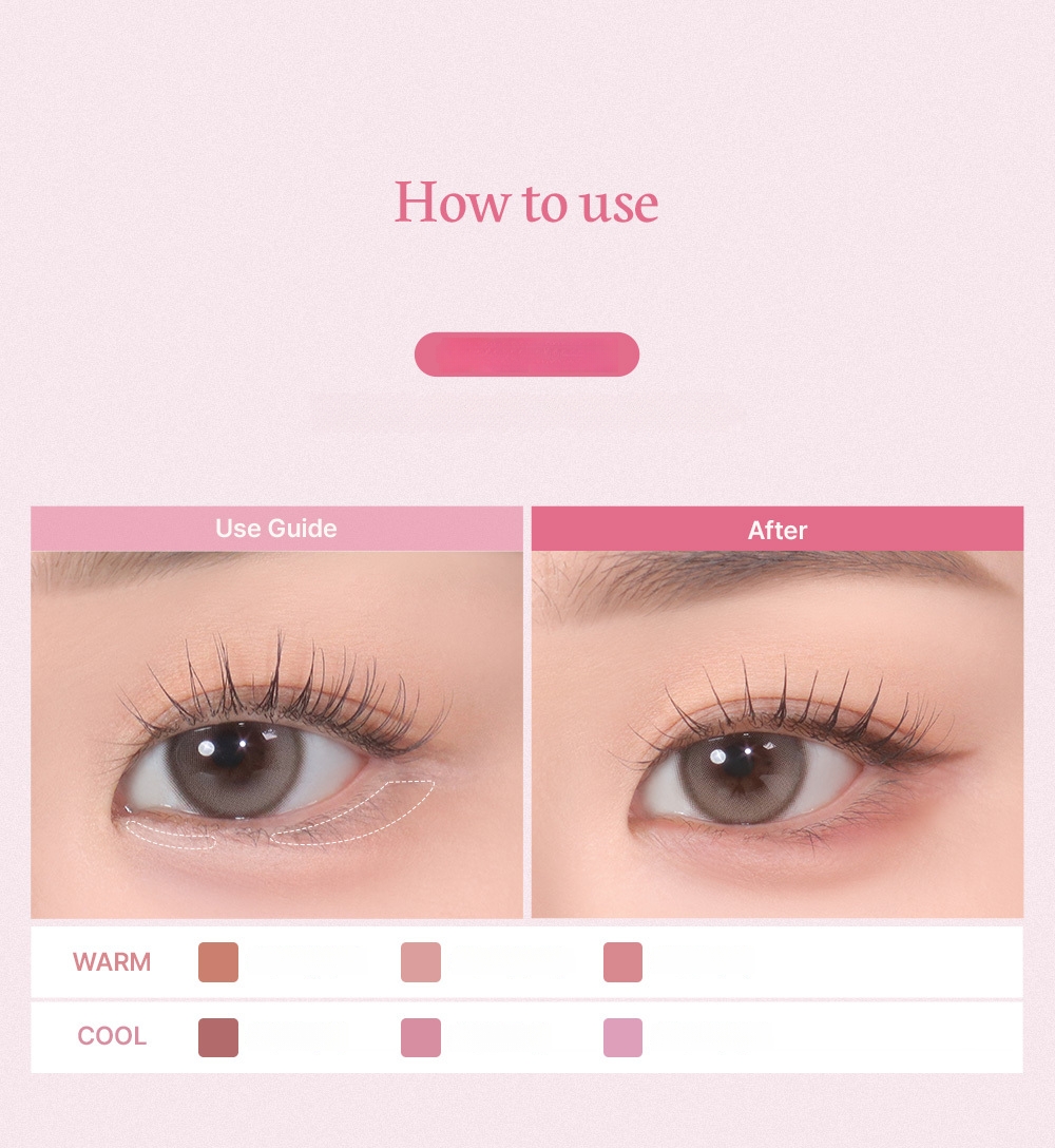 1. Use smudging liner that fits your skin tone to gently apply shade on corner of eyes and triangular zone. 2. Use blending brush to spread the shade. 3. Fill in fat under eyes and draw from middle to end of the waterline. 4. Use brush to blend color on fat under eyes and waterline.