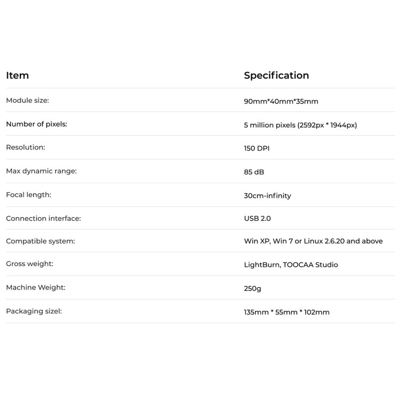 - 【Ready to use unboxing】The camera adopts a modular design, and uses high-precision screws to fix it to the laser-cutting machine. It can be used after the USB cable is connected to the device.