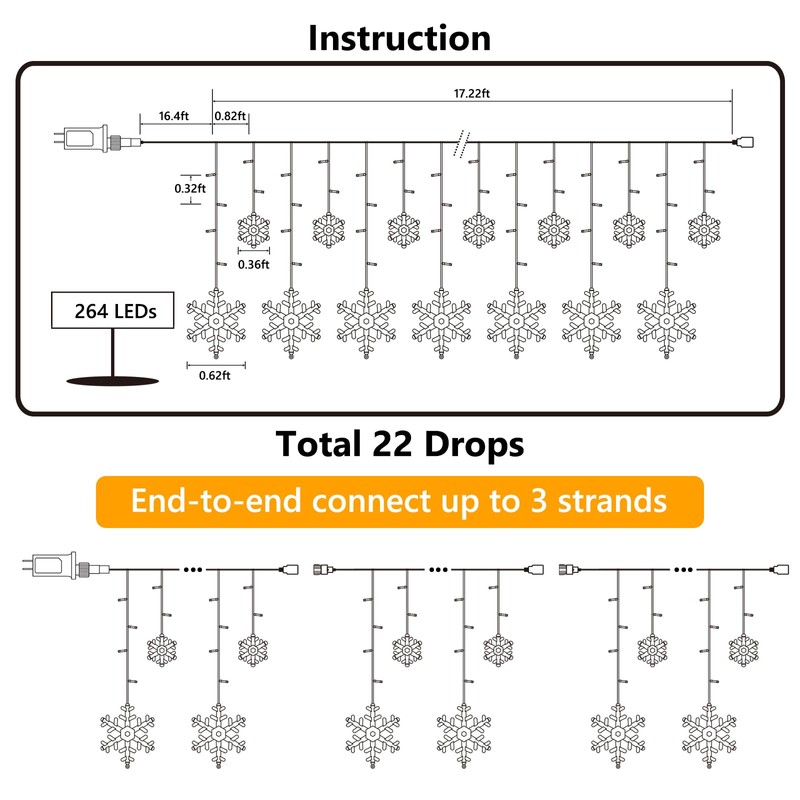 - Low Voltage Snowflake Icicle Lights: 264 bright LEDs, total 22 drops, the last bulb in each drop is wrapped by a LED snowflake ornament, which makes the Christmas lights looks like snowy. Light length 17.22ft, lead cable 16.4ft. Connectable, max 3 strands. The output voltage of the Christmas icicle snowflake lights is 30V, safe and energy saving. Compatible with all of USA standard outlet, with UL certified
