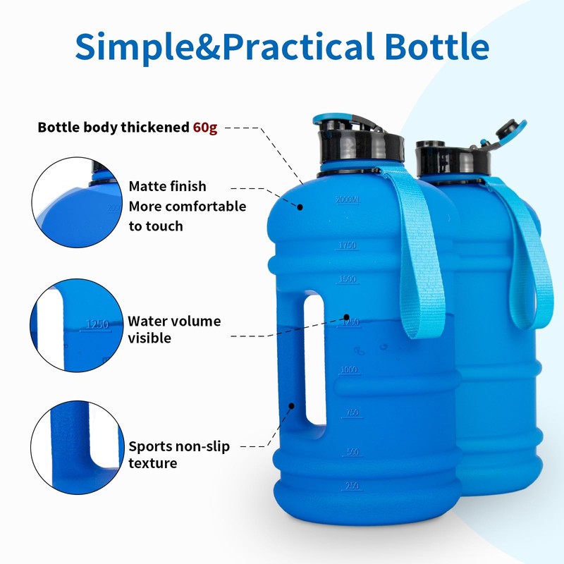 1. The half gallon water bottle capacity ensures that you can enjoy a full water bottle without having to refill it frequently. The water bottle body with measuring scale TOOFEEL helps you check the actual amount of water intake easily and clearly.