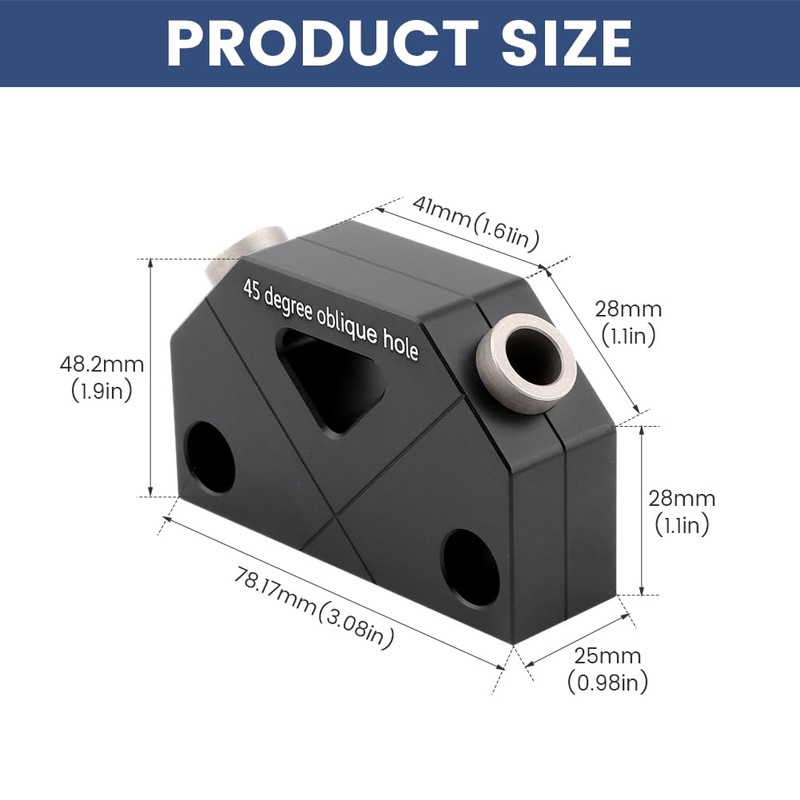 Dowel jig size: (L x W x H x top L x side L x side H)about 78.17 x 25 x 41 x 28 x 28mm/3.08 x 0.98 x 1.61 x 1.10 x 1.10inch